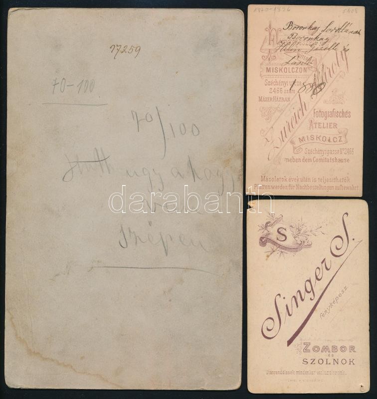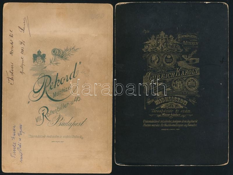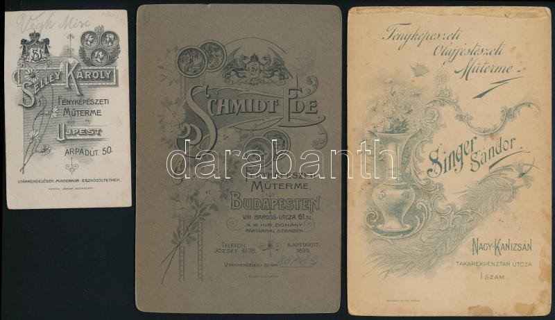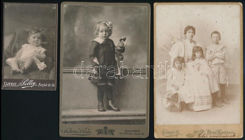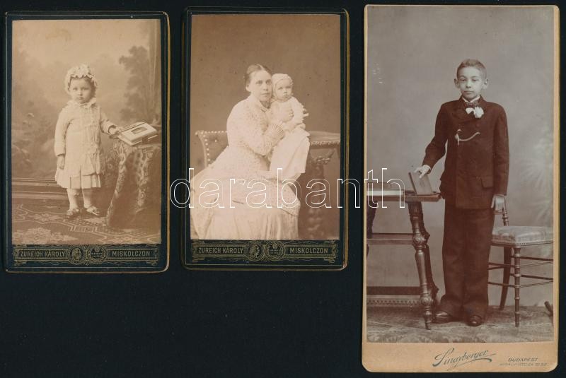 cca 1860-1890 Vegyes keményhátú fotótétel, 11 db, gyermekfotók, Bp. Singberger Béla (2 db), Miskolc Zureich Károly (4 db), Nagykanizsa Singer Sándor, Zombor-Szolnok Singer J., Ujpest Selley Károly, Bp. Schmidt Ede, Bp. Rekord Müintézet, 21x13 cm és 10x6 cm közötti méretben.
