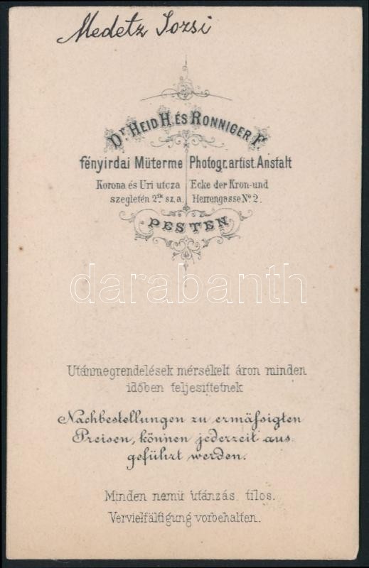 cca 1860 Medetz Józsi feliratozott, vizitkártya méretű fényképe, Dr. H... https://www.darabanth.com/hu/296-Gyorsarveres/296.0/Festmeny-mutargy-papirregiseg-egyeb/Foto~19/cca-1860-Medetz-Jozsi-feliratozott-vizitkartya-meretu-fenykepe-Dr-Heid-H-es-Ronninger-F-~II1573605