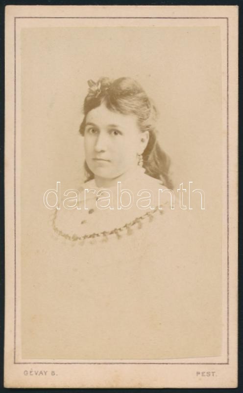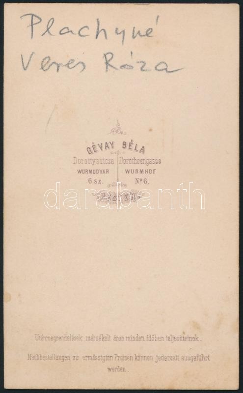 cca 1869 Plachyné Veres Róza (a felirat átvezetve egy vizitkártya tartó album lapjáról), Gévay Béla pesti műtermében készült, vizitkártya méretű fénykép, 10,5x6,5 cm