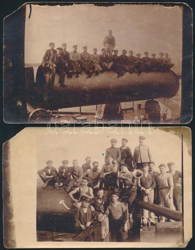Leírás: cca 1900 Hajósok a hajókéményen, 2 db fotólap, sarkain hiánnyal, 9x14 cm