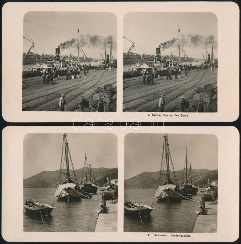 Leírás: cca 1906 Hajók és kikötők, 4 db vintage sztereófotó, mind feliratozva, 9x18 cm