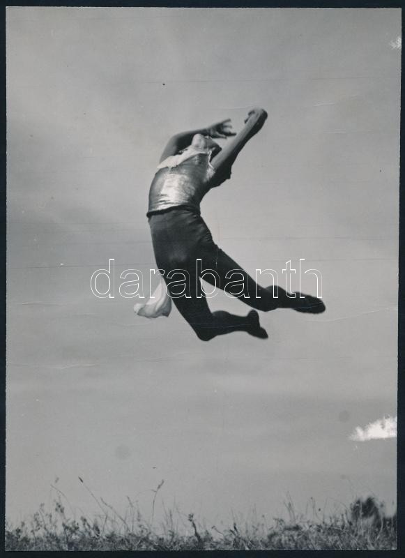 Leírás: cca 1935 Ugrás a felhők közé, jelzés nélküli vintage fotó, felületén törésvonalak, Szentpál Olga mozgásművészeti iskolájának archívumából, 23x17 cm