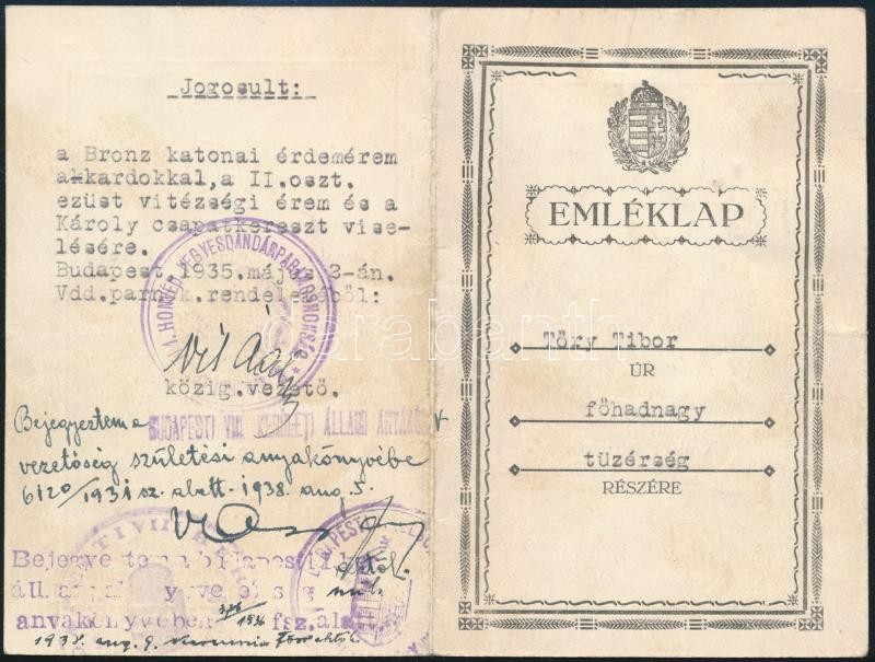 1935 Katonai igazolványok, fényképes emléklap egy azon személy részére... https://www.darabanth.com/hu/296-Gyorsarveres/296.0/Festmeny-mutargy-papirregiseg-egyeb/Militaria~25/1935-Katonai-igazolvanyok-fenykepes-emleklap-egy-azon-szemely-reszere~II1580093