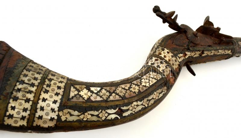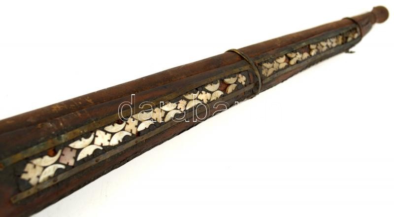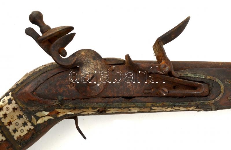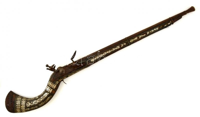Leírás: XVIII-XIX. századi muskéta, Gyöngyház berakással, megviselt állapotan / Vintage waffle in bad condition. 100 cm