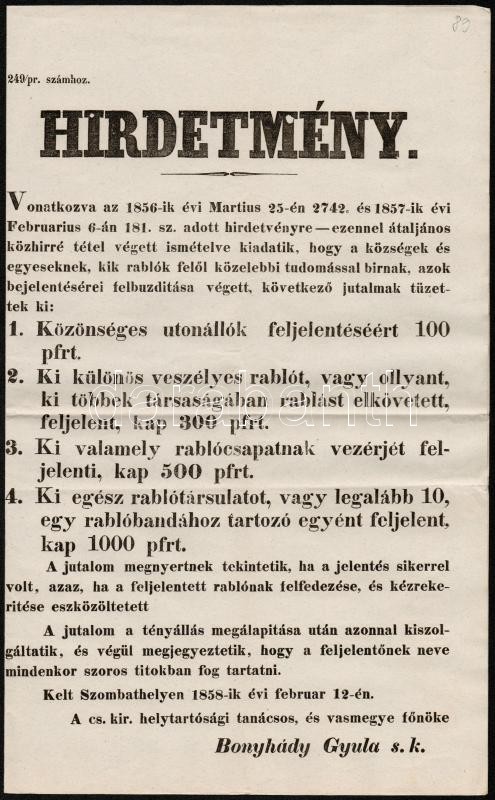 Leírás: 1858 Hirdetmény rablók és más gonosztevők körözése tárgyában 44x34 cm