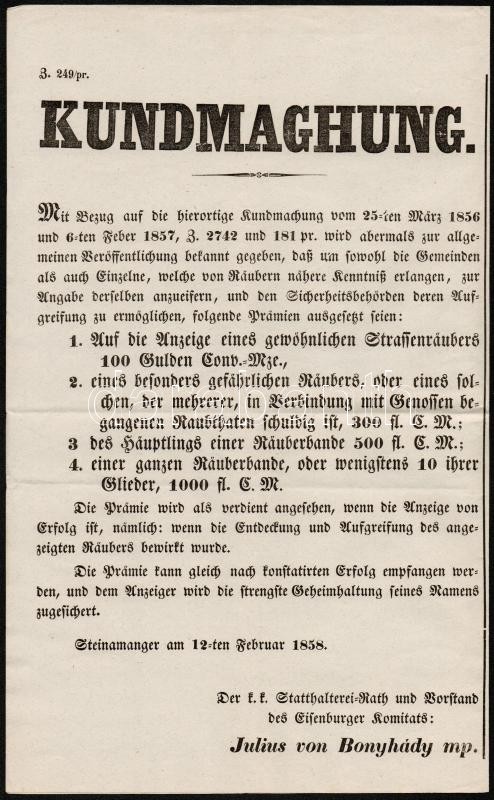 1858 Hirdetmény rablók és más gonosztevők körözése tárgyában 44x34 cm https://www.darabanth.com/hu/296-Gyorsarveres/296.0/Festmeny-mutargy-papirregiseg-egyeb/Plakat~28/1858-Hirdetmeny-rablok-es-mas-gonosztevok-korozese-targyaban-44x34-cm~II1581876