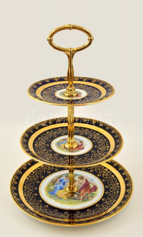 Leírás: Moritz Zdekauer historizáló csehszlovák porcelán emeletes kínáló. Aranyozott, matricás, új állapotban, eredeti dobozában, d: 25 cm