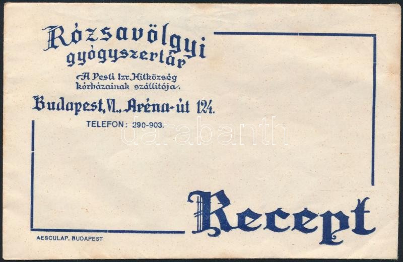 Leírás: Rózsavölgyi Gyógyszertár (A Pesti Izraelita Hitközség kórházainak szállítója) Budapest VI. receptborítékja