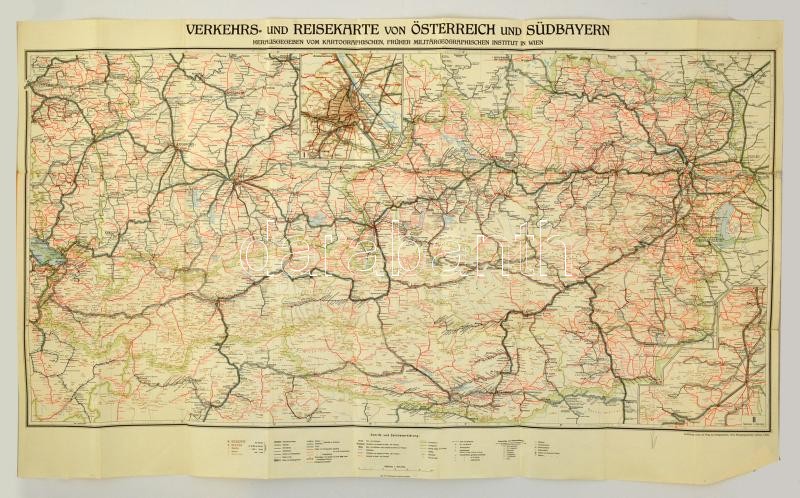 cca 1920-1930 Verkehers und Reisekarte von Österreich und Süd-Bayern, 1.600.000, Bécs, Kartographisches Früher Militärgeographisches Institut, német nyelven, kissé gyűrött borítóval, 63x105 cm./ cca 1920-1930 Verkehers und Reisekarte von Österreich und Süd-Bayern, 1.600.000, Vienna, Kartographisches Früher Militärgeographisches Institut, in German language, with a little creasing cover, 63x105 cm.