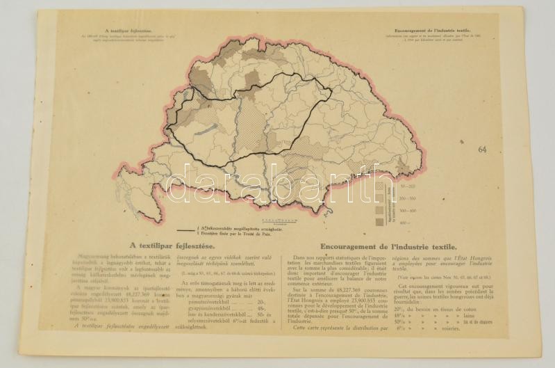 cca 1920 A textilipar fejlesztése 1914-ig Magyarországon, a "Magyarország gazdasági térképekben" kiadványból, magyar és francia magyarázó szöveggel, a trianoni határok feltüntetésével, 26,5×37,5 cm