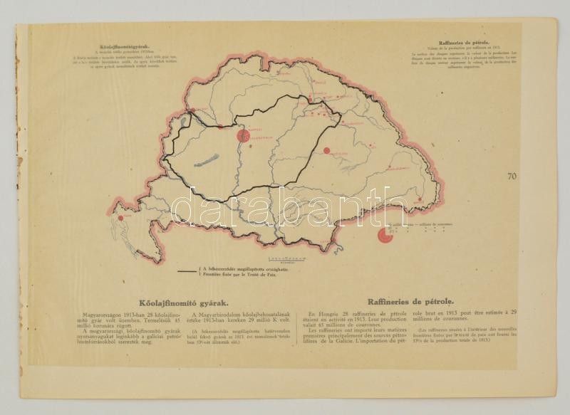 cca 1920 Kőolajfinomítógyárak Magyarországon 1913-ban, a "Magyarország gazdasági térképekben" kiadványból, magyar és francia magyarázó szöveggel, a trianoni határok feltüntetésével, 26,5×37,5 cm