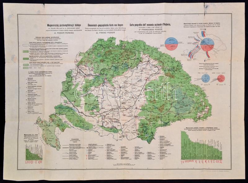 cca 1920 Magyarország gazdaságföldrajzi térképe. Teleki Pál és Cholnoky Jenő közreműködésével. Szerkesztette: Fodor Ferenc. 1:1.500.000. Bp., Magyar Földrajzi Intézet Rt. Magyar, német és olasz nyelven, szakadásokkal, 64x84 cm.