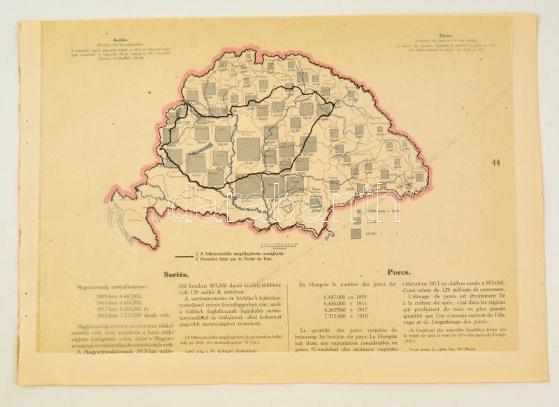 cca 1920 Sertésállomány megyénként 1917-ben, a "Magyarország gazdasági térképekben" kiadványból, magyar és francia magyarázó szöveggel, a trianoni határok feltüntetésével, 26,5×37,5 cm