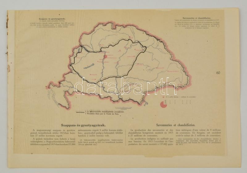 cca 1920 Szappan- és gyertyagyárak Magyarországon 1913-ban, a "Magyarország gazdasági térképekben" kiadványból, magyar és francia magyarázó szöveggel, a trianoni határok feltüntetésével, 26,5×37,5 cm