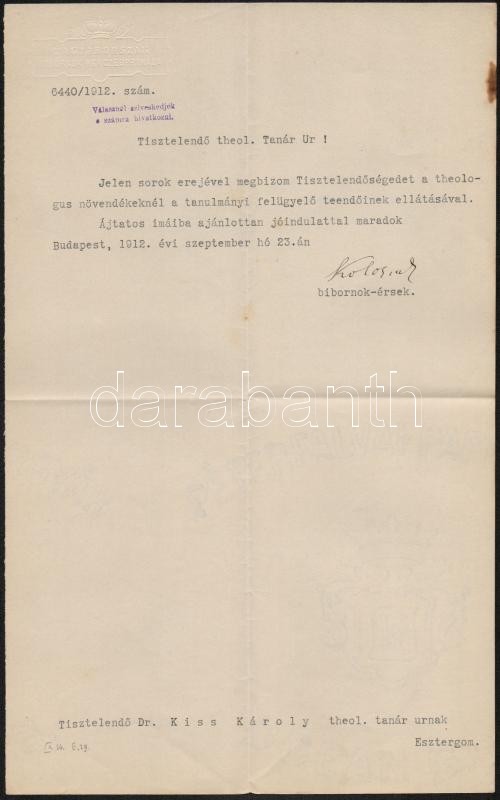 1912 Bp., Vaszary Kolos (1832-1915) bíboros saját kezű aláírása dr. Ki... https://www.darabanth.com/hu/296-Gyorsarveres/296.0/Festmeny-mutargy-papirregiseg-egyeb/Tortenelmi-dokumentumok-keziratok-erdekessegek~17/1912-Bp-Vaszary-Kolos-1832-1915-biboros-sajat-kezu-alairasa-dr-Kiss-Karoly-teologia-tan~II1578764