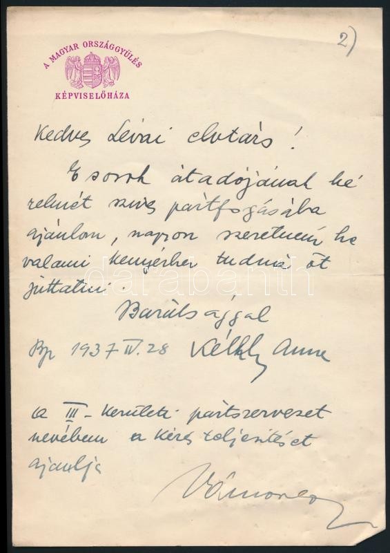 Leírás: 1937 Bp., Kéthly Anna (1889-1976) pártfogásba vételről szóló levele Lévai elvtárshoz a Magyar Országgyűlés Képviselőházának levélpapírján