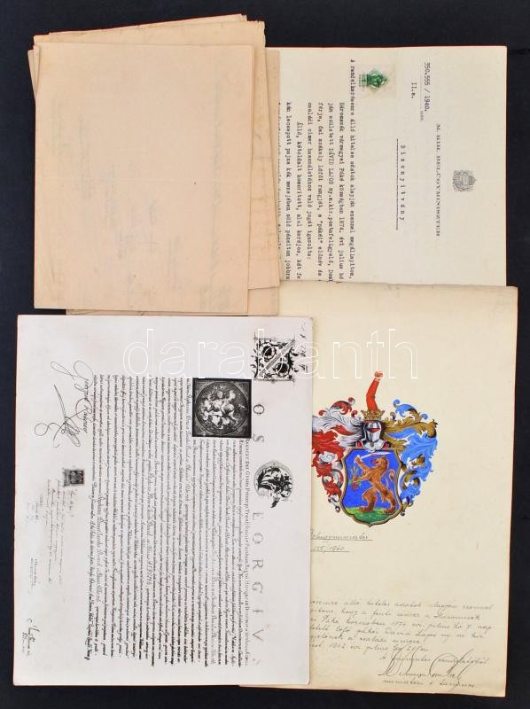 Leírás: cca 1940 A pákéi Dávid-családra vonatkozó iratok: címerrajz, igazolás a címeradományról, illetve a címereslevél hiteles másolata, stb.