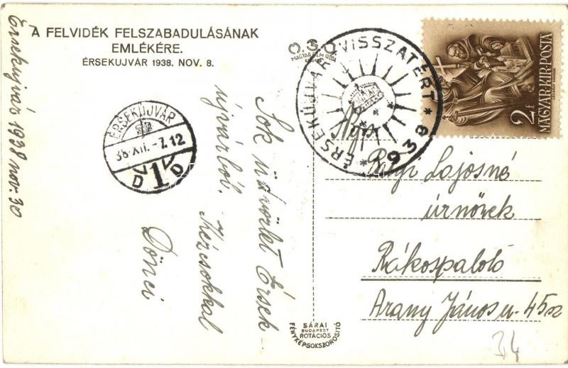 Leírás: 1938 Érsekújvár, Nové Zamky; bevonulás / entry of the Hungarian troops, '1938 Érsekújvár visszatért' So. Stpl