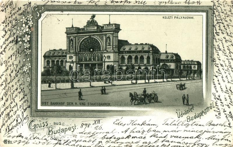 1898 Budapest VII. Keleti pályaudvar, floral Art Nouveau litho (EK) https://www.darabanth.com/hu/296-Gyorsarveres/296.0/Kepeslapok/Magyarorszag~100005/1898-Budapest-VII-Keleti-palyaudvar-floral-Art-Nouveau-litho-EK~II1579177