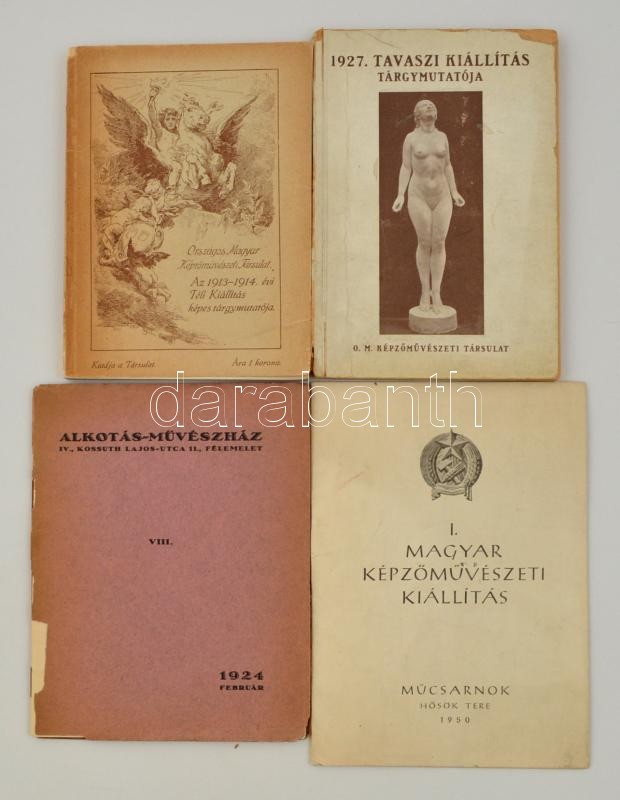 Vegyes művészeti katalógusok, 4 db: Az 1913-14 évi Téli Kiállítás képes tárgymutatója. Budapest, 1914, Országos Magyar Képzőművészeti Társulat. Kiadói illusztrált papírkötés, hiányos gerinccel, szakadt borítóval, számos fekete-fehér fotóval, reklámokkal. Török Jenő, Meitner László, Kéz Kornis József együttes kiállítása. Alkotás-művészház. Bp., 1924. Kunossy Grafikai Müintézet Rt.-ny. Kiadói papírkötés, a borítója szakadt, az elülső borító elvált a könyvtől. Tavaszi kiállítás tárgymutatója. Bp., 1927, Országos Magyar Képzőművészeti Társulat., Athenaeum-ny. Kiadói papírkötés, megviselt állapotban, szakadozott borítóval, a könyv gerince részben elvált a borítótól. I. Magyar Képzőművészeti kiállítás. Bp., 1950, Szikra-ny. Kiadói papírkötés.