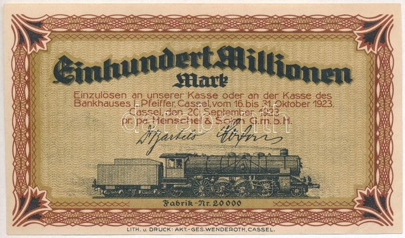 Németország / Weimari Köztársaság / Cassel / Henschel és Fia Kft. 1923. 100.000.000M szükségpénz T:III szép papír