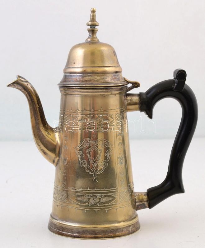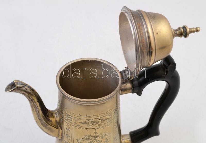 Leírás: Rezezett alpakka kávés kiöntő, bakelit markolattal, vésett díszítéssel, kopott, hiányos, m: 21 cm.