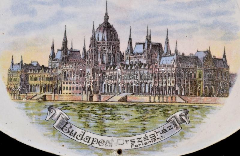 Leírás: cca 1910 Parlament, matricás mázas fajansz plakett, sérült, jelzés nélkül, 14×20 cm