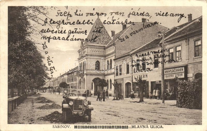 Kisszeben, Sabinov; Hlavná ulica / Fő utca, városháza, automobil, L. Stern kereskedése, Gustav Stehr üzlete és saját kiadása / main street, city hall, automobile, shops (EK)