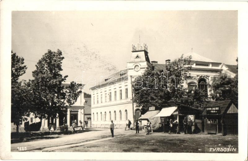 Leírás: Turdossin, Turdosin, Tvrdosín; sétatér, városháza, Anton Jakubec pék üzlete / promenade, city hall, shops, bakery (EK)