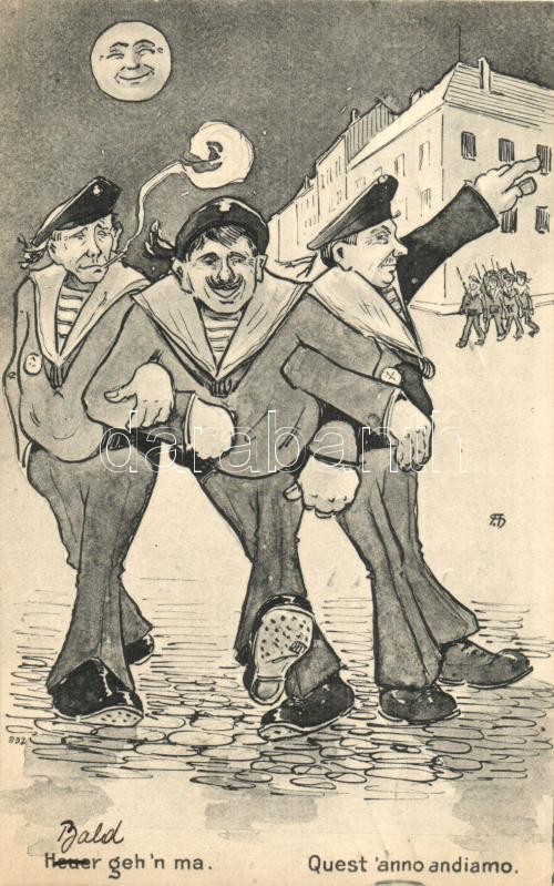 Heuer geh'n ma / Quest'anno andiamo / K.u.K. Kriegsmarine, mariners on... https://www.darabanth.com/hu/297-Gyorsarveres/297.0/Kepeslapok/Hadihajo~80/Heuer-gehn-ma-Questanno-andiamo-KuK-Kriegsmarine-mariners-on-leave-drunk-at-night-humour~II1589663