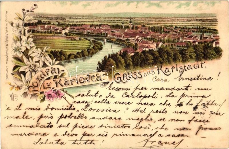 Leírás: 1897 (Vorläufer!) Károlyváros, Karlstadt, Karlovac; general view, Heinrich Krapek floral Art Nouveau litho