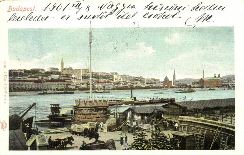 Leírás: Budapest, látkép, pesti rakpart (ma Id. Antall József rakpart), gőzhajók, létrák, G. Rüger & Co. kiadása (EK)