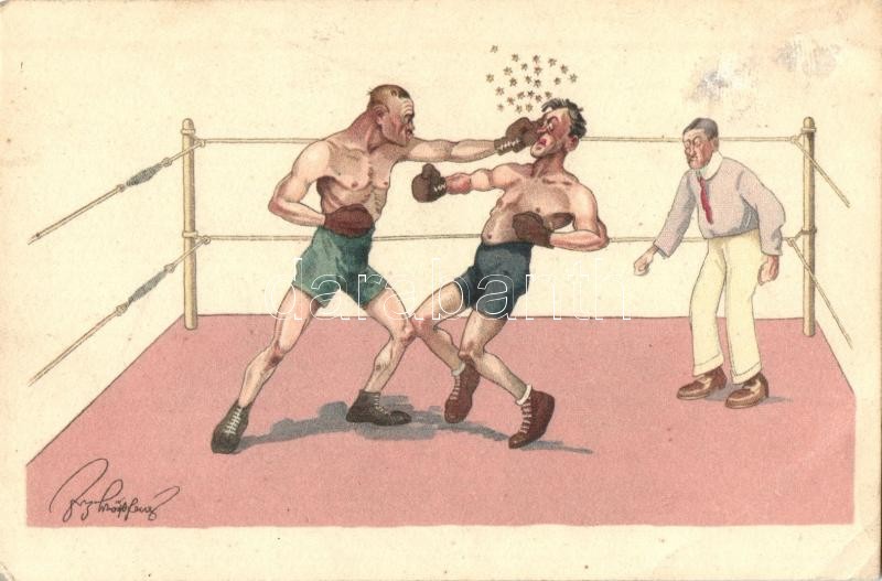 2 db humoros sport motívumlap: ökölvívók Fritz Schönpflug aláírásával (régi), jégkorcsolyázók (modern) / 2 humorous sport motive cards, box match with the signature of Schönpflug (pre-1945), ice skaters (modern)