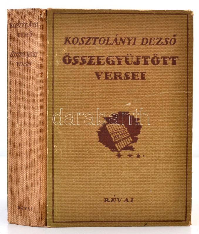 Kosztolányi DezsÅ‘ összegyűjtött versei. Bp., (1944), Révai. Kiadói kissé kopottas félvászon-kötés, kissé viseltes az elülsÅ‘ kötéstábla belseje, kijáró elülsÅ‘ szennylappal, elÅ‘zéklappal, és cÃmoldallal, szakadt utolsó oldallal és hátsó szennylappal,