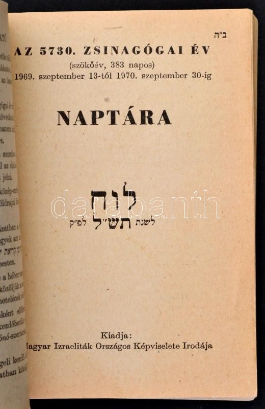Leírás: Az 5730. zsinagógai év naptára. Bp., 1969, Magyar Izraeliták Országos Képviselete Irodája. Kiadói papírkötés.