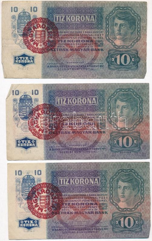 1915. 10K (3x) mindhárom piros "MAGYARORSZÁG" körbélyegzővel T:III https://www.darabanth.com/hu/297-Gyorsarveres/297.0/Numizmatika/Magyar-bankjegyek~500007/1915-10K-3x-mindharom-piros-MAGYARORSZAG-korbelyegzovel-TIII~II1590350