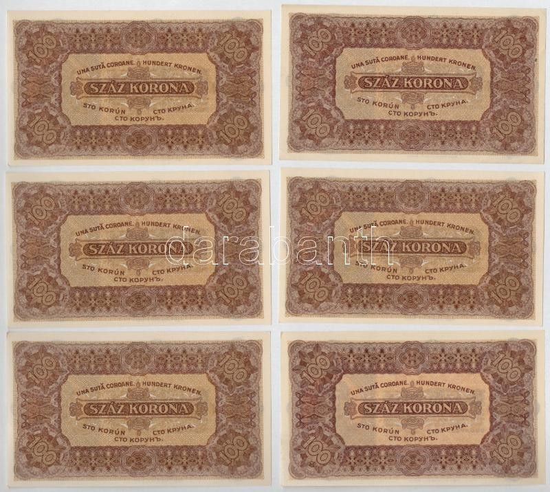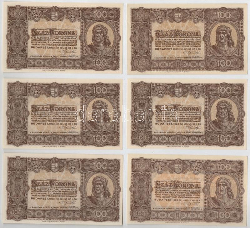 Leírás: 1923. 100K (6x) "Magyar Pénzjegynyomda Rt." nyomdahely jelöléssel T:I