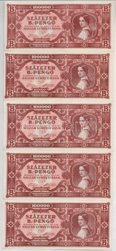 1946. 100.000BP (5x) T:I,I- https://www.darabanth.com/hu/297-Gyorsarveres/297.0/Numizmatika/Magyar-bankjegyek~500007/1946-100000BP-5x-TI-I-~II1576859