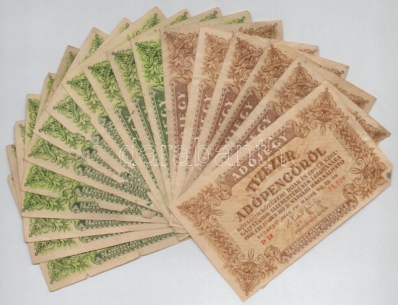 1946. 10.000AP (6x) + 1946. 50.000AP (12x) T:III,IV https://www.darabanth.com/hu/297-Gyorsarveres/297.0/Numizmatika/Magyar-bankjegyek~500007/1946-10000AP-6x-plus-1946-50000AP-12x-TIII-IV~II1590415