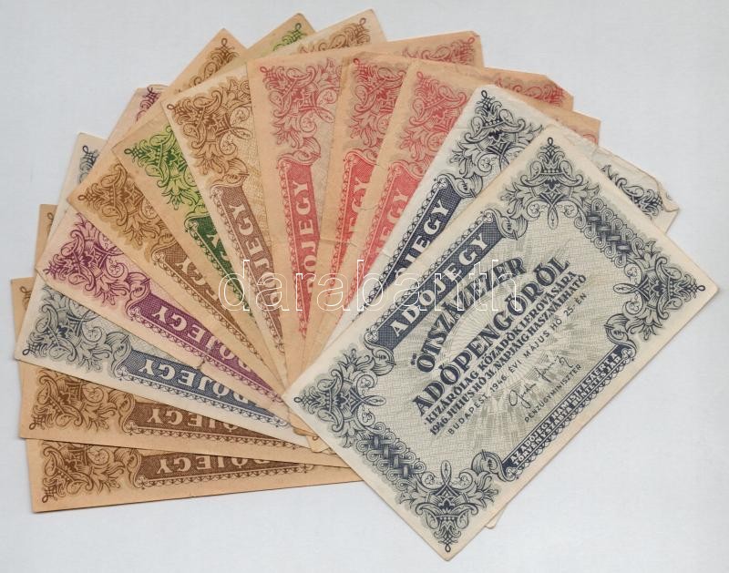 Leírás: 1946. 12db-os vegyes magyar adópengő bankjegy tétel, közte fordított címeres is T:III,III-
