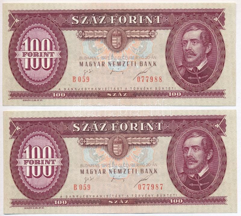 1995. 100Ft (2x) sorszámkövetők T:I- https://www.darabanth.com/hu/297-Gyorsarveres/297.0/Numizmatika/Magyar-bankjegyek~500007/1995-100Ft-2x-sorszamkovetok-TI-~II1583449