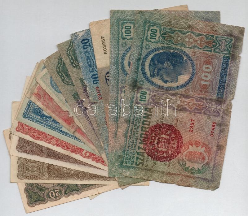 Leírás: Vegyes: 14db-os korona tétel 1912-1920. közötti kiadások 1-100K közötti névértékek T:III-IV