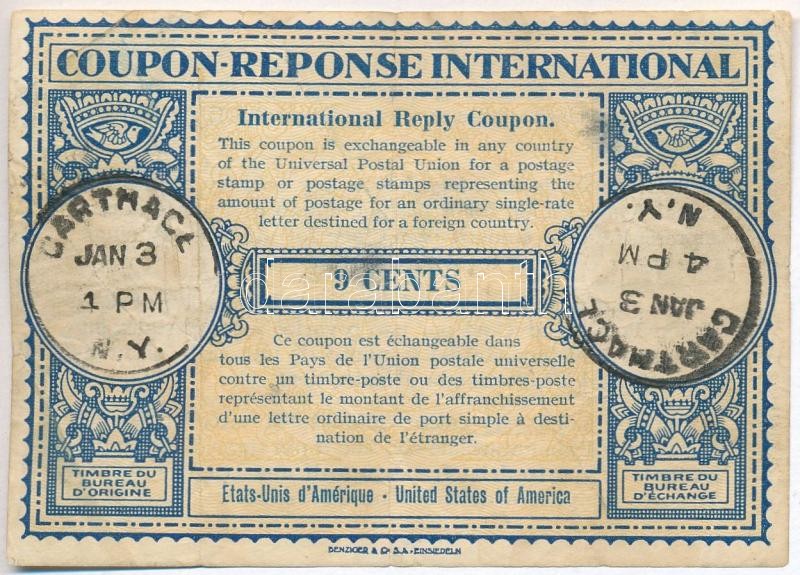 USA ~1940-1950. 9 Cents "International Reply Coupon" on watermarked paper, with stamp C:F