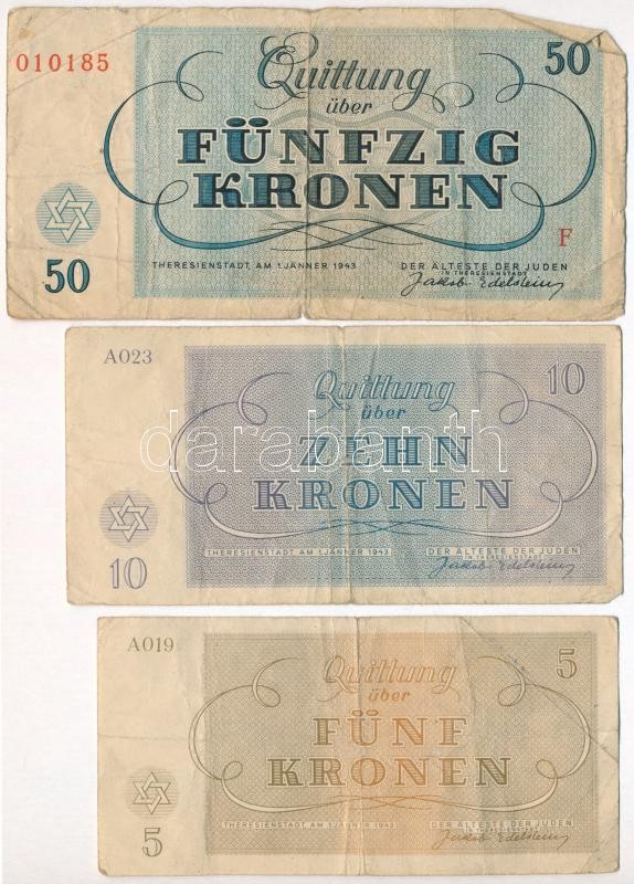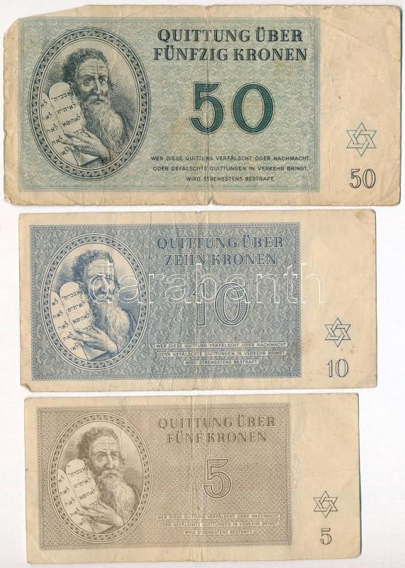 German Third Reich / Protectorate of Bohemia and Moravia / Theresienstadt ghetto 1943. January 1. 5 Kronen + 10 Kronen + 50 Kronen C:F,VG