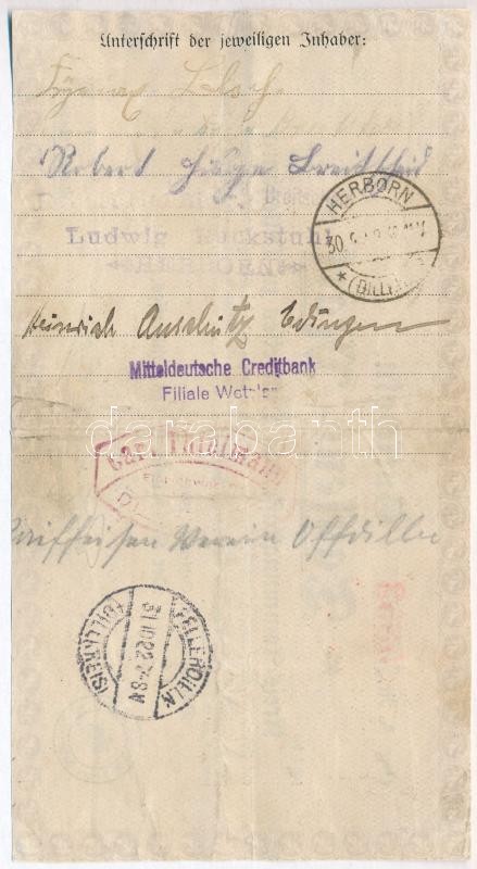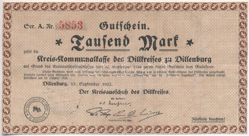 Németország / Weimari Köztársaság / Dillenburg 1922. 1000M szükségpénz, hátoldalán pecsételések T:III