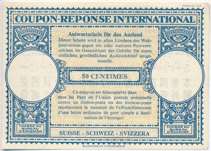 Switzerland ~1940-1950. 50 Cents "International Reply Coupon" on watermarked paper, without stamp C:UNC