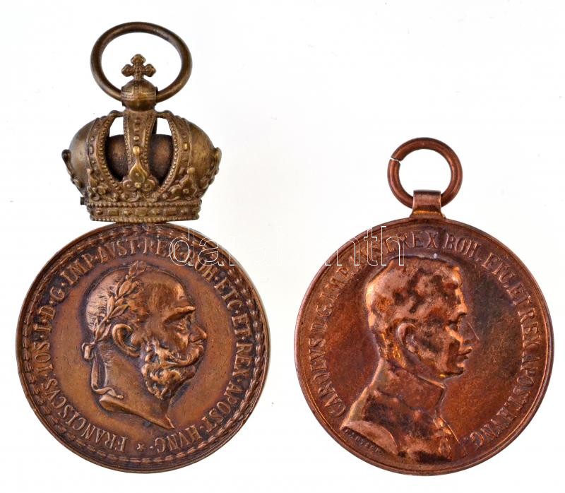 Leírás: 1890. "Bronz Katonai Érdemérem" aranyozott Br kitüntetés mellszalag nélkül + 1917. "Károly Bronz Vitézségi Érem" Br kitüntetés mellszalag nélkül. Szign.: Kautsch T:2,2-