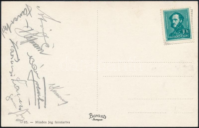 cca 1930 A Ferencváros labdarúgó csapatának játékosok aláírása képeslapon (pl.: Korányi Toldi, Lázár, Takács stb...) aláírásával. / cca 1930 Signed postcard of the FTC