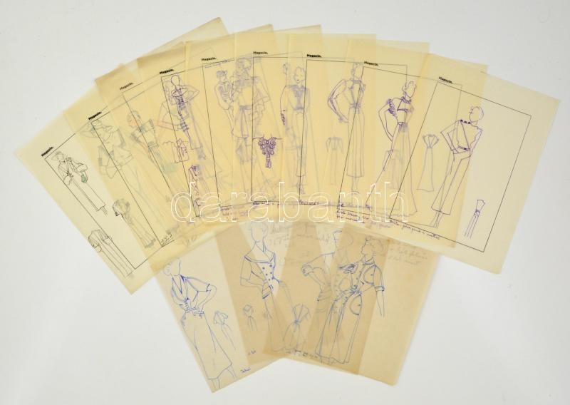 Jelzés nélkül: Divatrajzok. 13 db, pauszpapír, vegyes technika, 23x16 ... https://www.darabanth.com/hu/298-Gyorsarveres/298.0/Festmeny-mutargy-papirregiseg-egyeb/Festmenyek-es-grafikak~100001/Jelzes-nelkul-Divatrajzok-13-db-pauszpapir-vegyes-technika-23x16-es-31x24-cm~II1594200