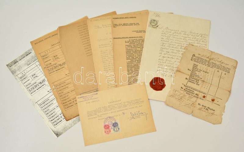 Vegyes militária tétel, valamint egy okmány, 4 db (3db+1db): 1775-1776 Elszámolás az 1775-76-os katonai év királyi adójához való hozzájárulásról, szakadozott, 22x17cm 1945 Gévay József (1890-?) ezredes, a 2. magyar híradóépítő zászlóalj parancsnokának jelentése jelentése az igazoló bizottság részére 1939-1945 közötti katonai tevékenységéről, kézirat, valamint az arról készül gépelt (saját) példány, illetve annak kivonatolt gépelt változata. 1973 Igazolás hadnaggyá való kinevezéséről, Honvédelmi Minisztérium, kartonra ragasztva, okmánybélyeggel, 15x21cm 1864 Lakatos József beregszászi tanácsos vagyonnyilatkozata, Beregszász város ált. kiállítva, a város jegyzőjének, és főbírájának aláírásával, 1 ft. okmánybélyeggel, Beregszász város viaszpecsétjével.